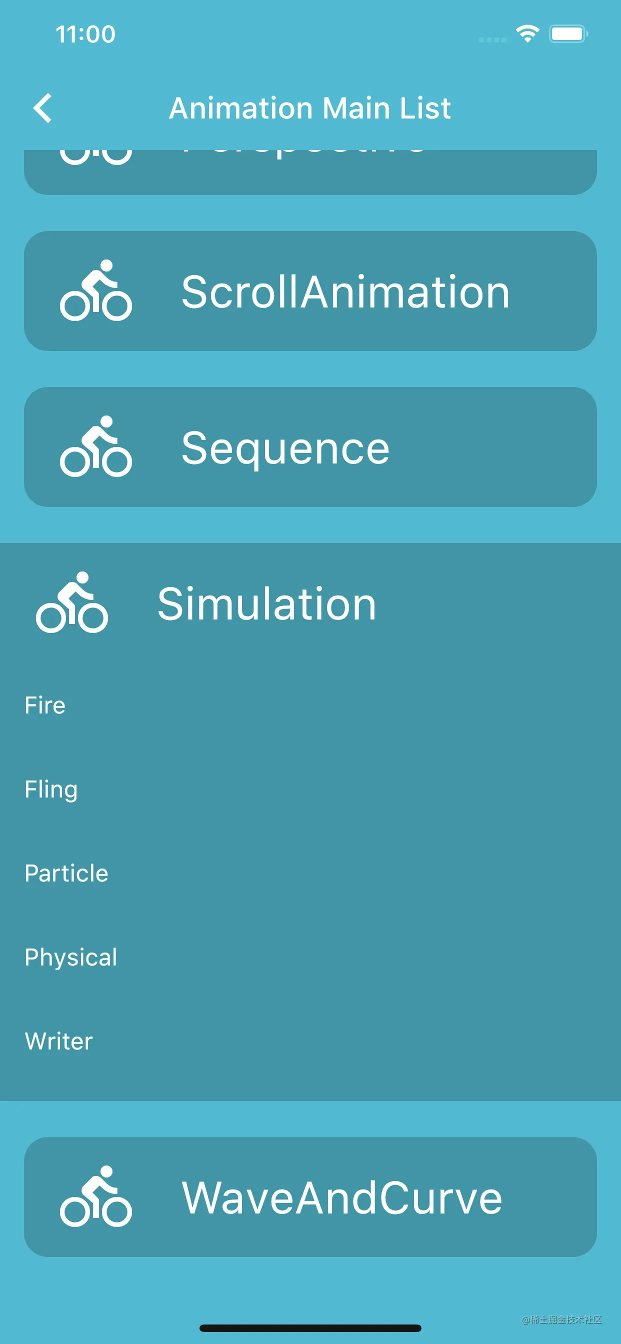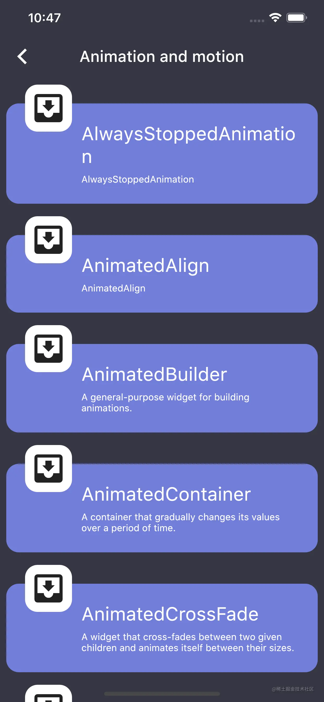 Animations部分的设计思路是为了让开发者对Flutter的动画有一个完整的认识,针对不同的场景使用不同的动画方案,同时,对大部分常见的动画场景进行梳理,完成动画场景的归类。