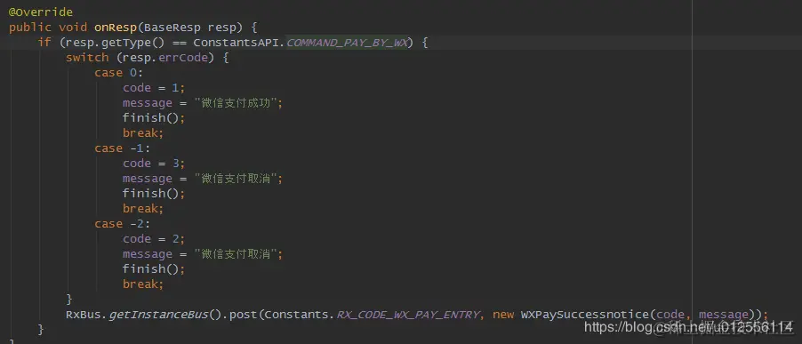 4.支付回调WXPayEntryActivity关键代码和Manifast配置如下:切记,支付完成或发生错误时都要发送广播或者rxbus去刷新界面.