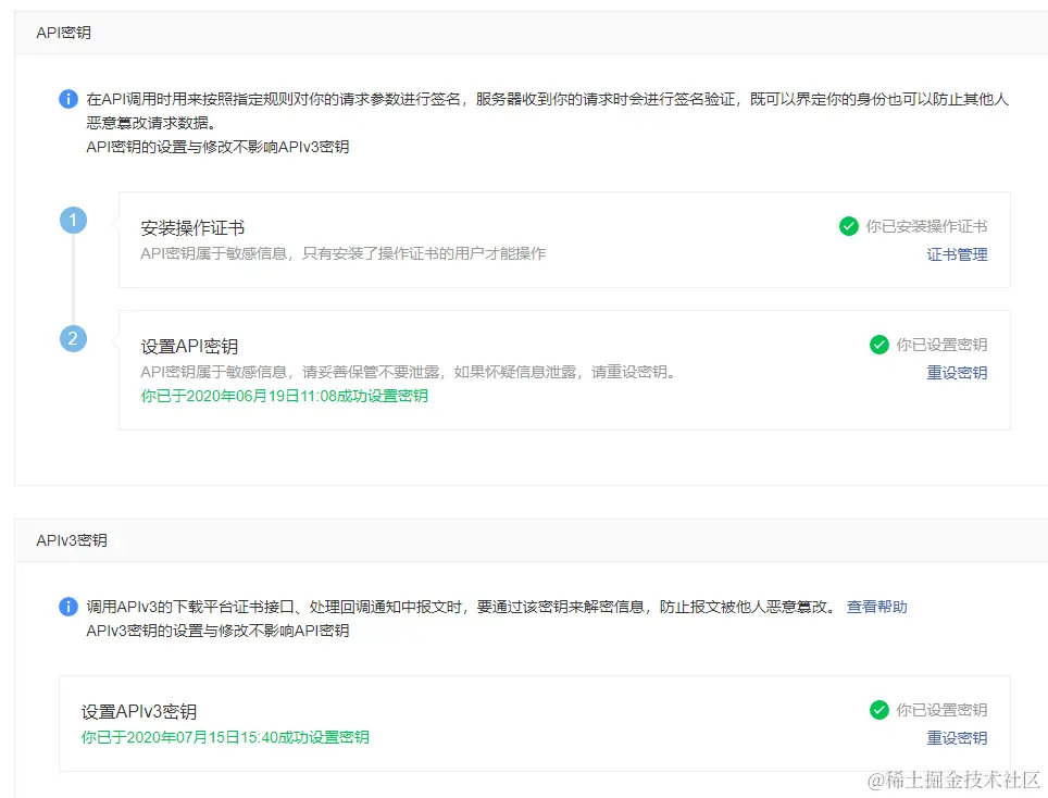 一脸蒙蔽,什么情况???去官网查找资料,说是没有配置支付密钥,登录官网商户后台,发现支付密钥和证书都配置了,因为现在的微信支付都是调用V3接口,所以还得在V3那些配置一个V3的支付密钥。