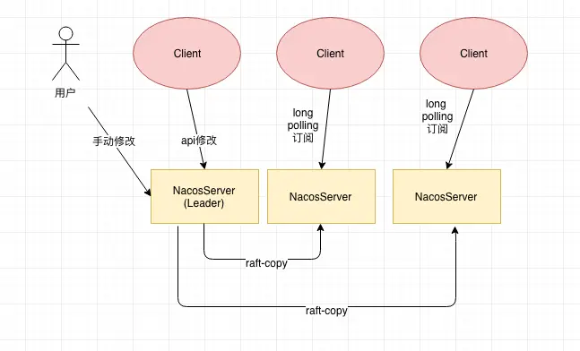 在Nacos中使用的是sofa-jraft,这个是蚂蚁开源的一个java版本高性能的raft实现,不熟悉raft的同学可以阅读以下raft的论文,了解过raft的同学应该都知道raft非常强化Leader的概念: