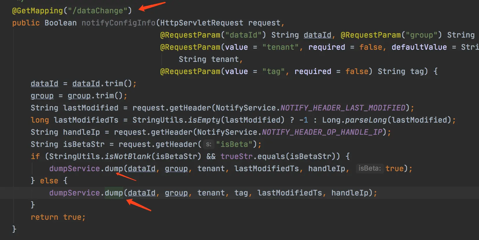 - Step3: 服务端存储这个AsyncContext,等待配置的变更,数据的变更会通过DataChangeEvent事件中进行触发,然后判断之前请求中的md5和新更新的md5是否一样,如果一致将变更信息写入到AsyncContext的response中。