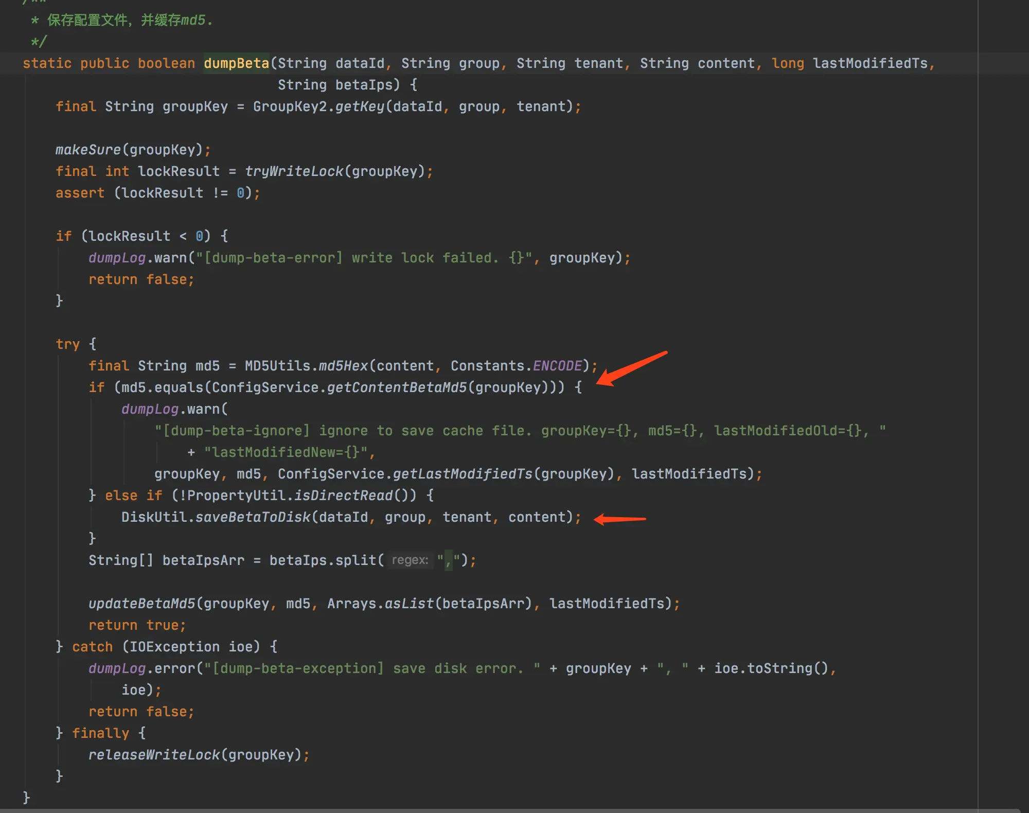 会先查询元数据中的MD5,MD5其实也是根据我们配置中的值算出来的,所以能进行快速判断这一次时候发生了值的变更,如果发生变更,我们就将这个值存储到磁盘上。