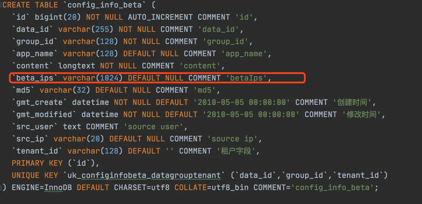 在nacos中的具体实现的是用一个单独的表去保存beta相关的信息:
