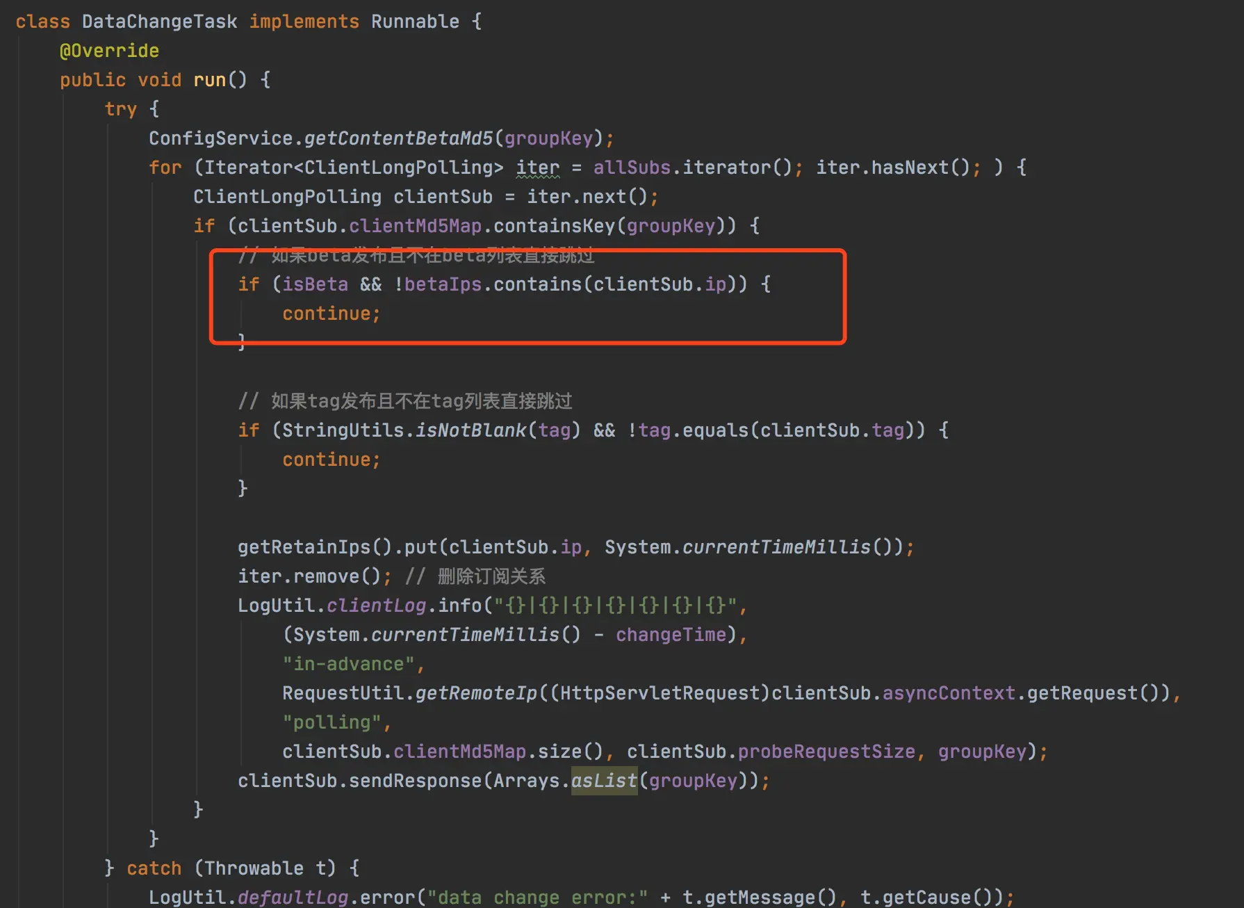 用beta_ips字段保存了我们需要灰度的机器,在客户端订阅进行长轮训的时候,也会过滤是否是灰度的机器,如果是才会进行更新,下面是LongPollingService的代码:
