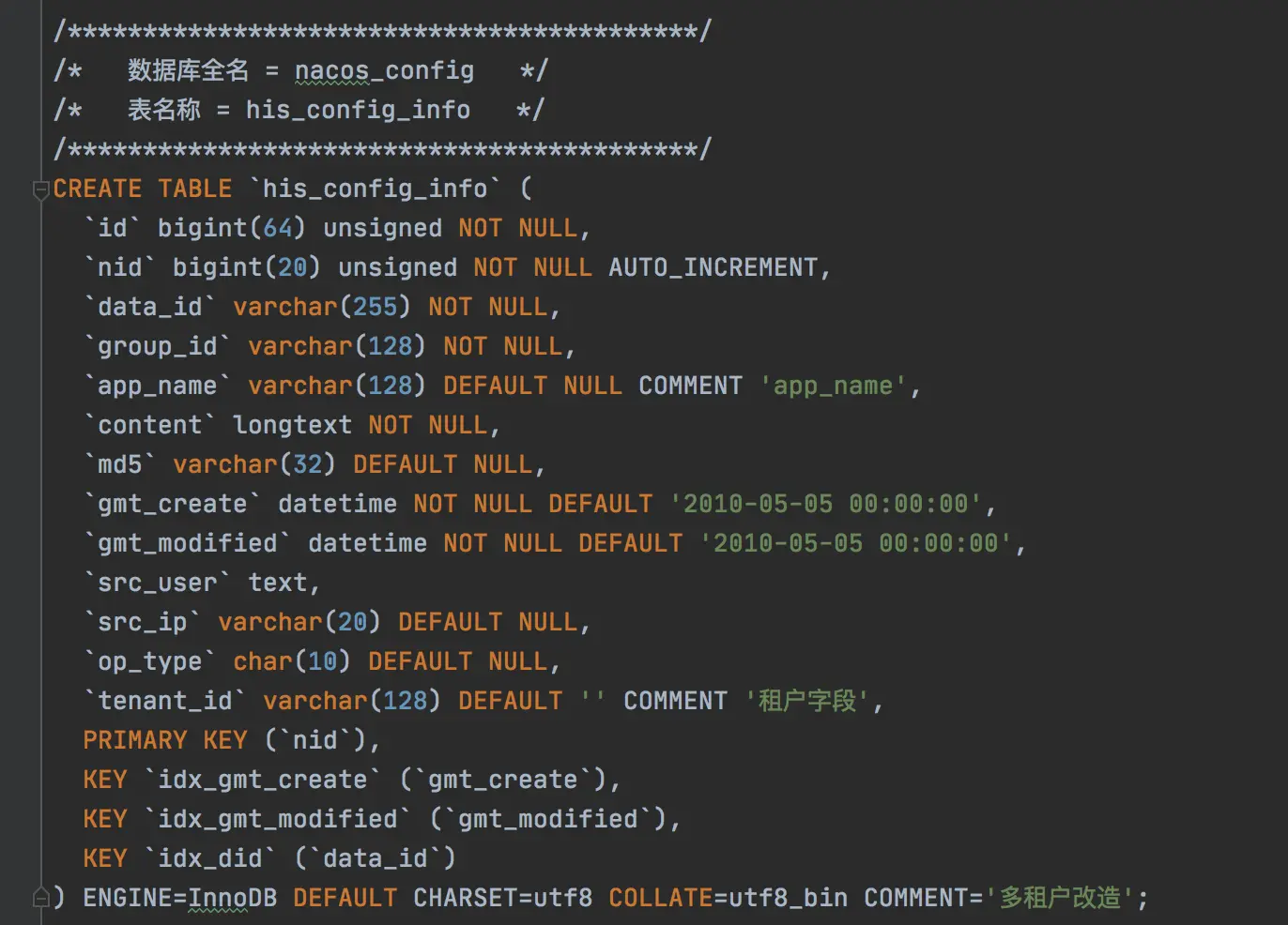 在Nacos中也提供了历史版本,类似git的commit一样,只要你有commitid你就能回滚到对应的版本,在Nacos用了一个history_config表来进行保存,我们可以通过这个表获取我们某个配置的所有历史,以此来进行回滚。