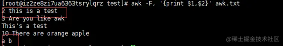awk -F, '{print 2}' awk.txt 不再使用默认的空格或者tab分割,指定使用,号分割