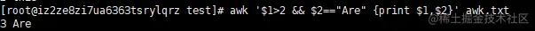 awk '1>2 && 2=="Are" {print 2}' awk.txt