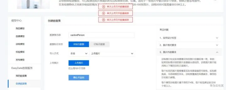 但是存在一个及其让人难受的Bug,当你一次性选择大于100张图片时,在你上传完所有图片后,会提示你数据超限,需要重新上传。