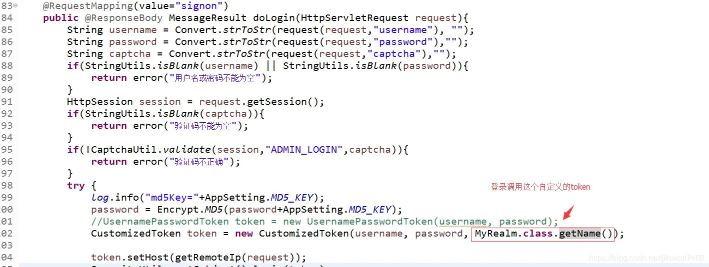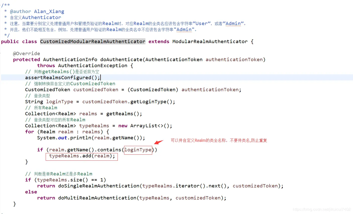 当调用SecurityUtils.getSubject().login(token); 即subject的login 方法;默认会调用realm里面的doGetAuthenticationInfo方法进行身份验证。但上面设置了 配置使用自定义认证器