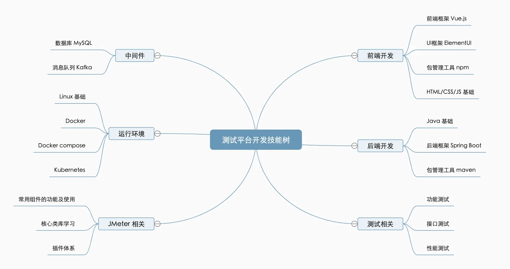 我们将能力拆分成 6 个方面来看,分别是测试相关、JMeter 相关前端开发、后端开发、中间件和运行时环境。