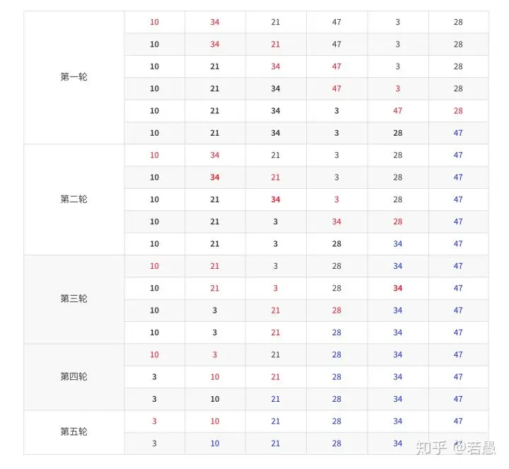 以下表格里,红色表示选中的待排序的数字,粗体表示本轮刚刚排列过的数字,蓝色表示最终排好的数字。