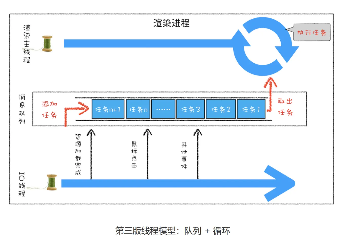 - 渲染主线程会循环地从消息队列头部中读取任务,执行任务。