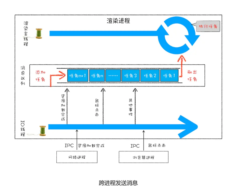 - 如果其他进程想要发送任务给页面主线程,那么先通过 IPC 把任务发送给渲染进程的 IO 线程,IO 线程再把任务发送给页面主线程。