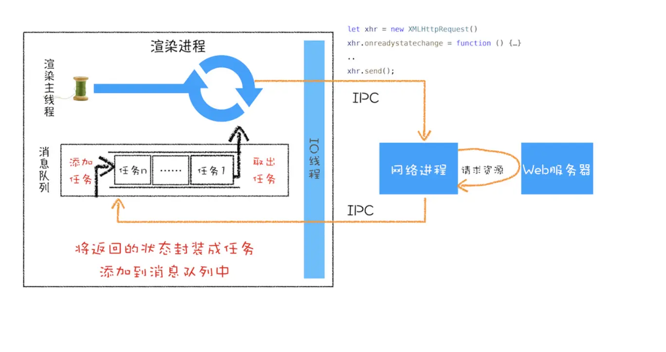 XMLHttpRequest 发起请求,是由浏览器的其他进程或者线程去执行,然后再将执行结果,利用 IPC 的方式通知渲染进程,之后渲染进程再将对应的消息添加到消息队列中。
