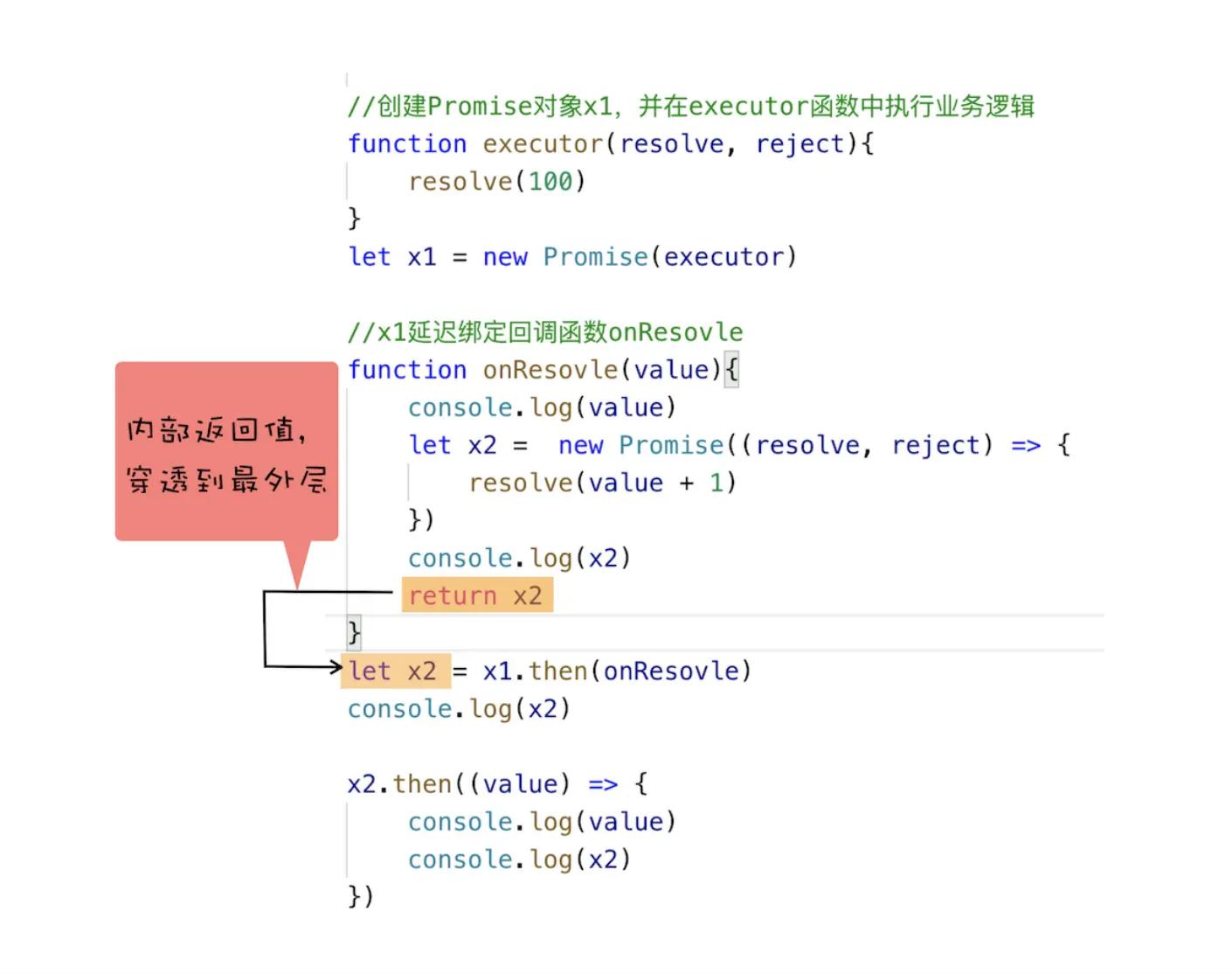 因为我们会根据 onResolve函数的传入值来决定创建什么类型的 Promise 任务,创建好的 Promise 对象需要返回到最 外层,这样就可以摆脱嵌套循环了。