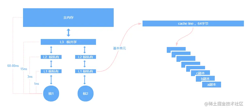 - 在抢占的时间片内,线程1执行过程中若需要访问共享变量,就会去高速缓存中查找,若缓存miss则从主内存(也有可能从其他核的L1L2中查找)加载(此处包含预加载,为什么要有预加载见局部性原理)