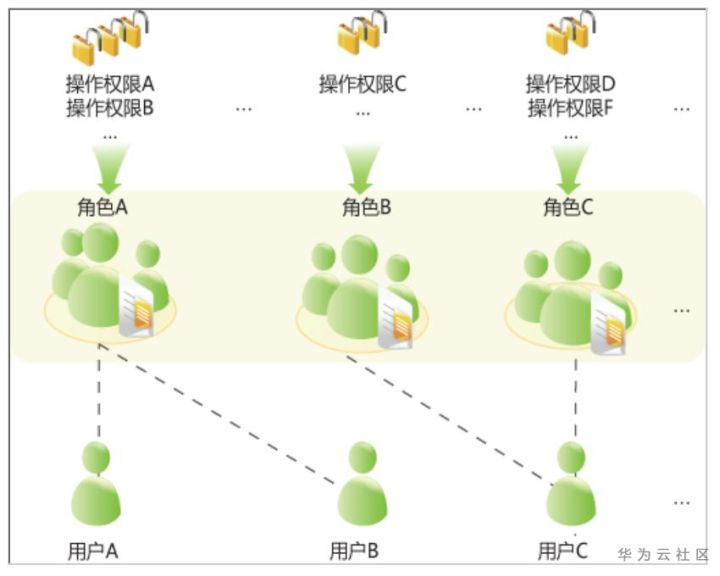 l 角色A:授予操作权限A和B,用户A和用户B通过分配角色A取得对应的权限。