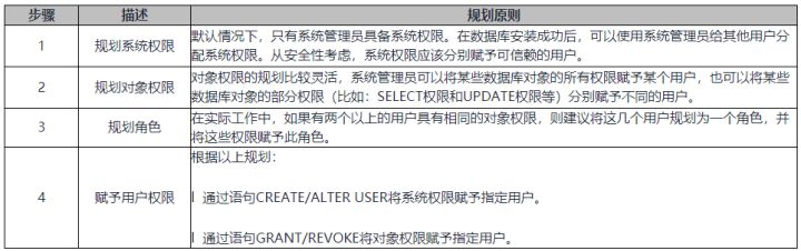 通过GRANT把角色授予用户后,用户即具有了角色的所有权限。推荐使用角色进行高效权限分配。只对自己的表有所有权限,对其他用户放在属于各自模式下的表无权限。