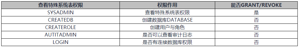 数据库系统特定操作的能力,系统权限又称为用户属性,包括SYSADMIN、CREATEDB、CREATEROLE、AUDITADMIN和LOGIN。