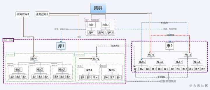 集群中可以创建多个库,库与库之间物理隔离,集群中的用户和角色是唯一并且全局共用的,访问库的权限通过用户进行控制,同一个库中,schema是唯一的,不同schema下可以创建同名表,表与表之间通过schema进行区分,不同用户之间的数据访问通过权限控制进行隔离,不同用户间表的访问权限通过用户进行维护,通过角色进行权限统一管理,一个用户下可创建不同schema区别不同的业务模块,通过不同用户提供给不同业务使用。