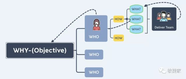 影响地图是这样一种方法或工具:完全以业务目标为导向,业务+产品+研发在一起共创,每一个碰撞出来的点子都直接和业务结果强相关,并采用探索、低成本试错的方式,通过迭代快速持续开发实现。影响地图的基本模型:(分为WHY-WHO-HOW-WHAT四层级)