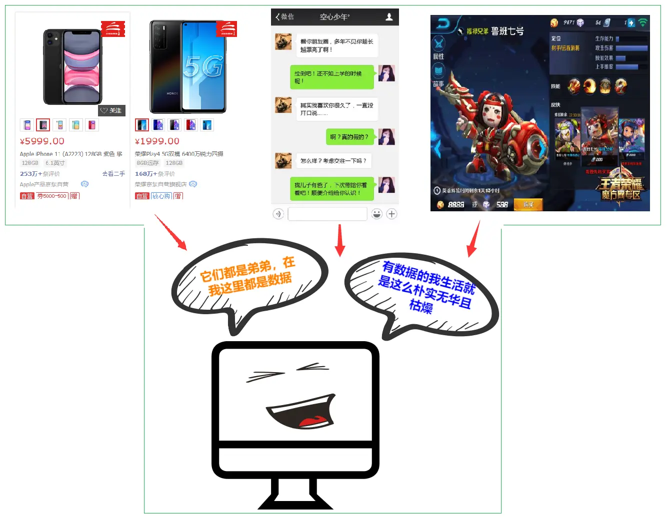 比如:我们微信聊天发送的文字、图片、语音、视频等对于计算机来说就是数据,我们上网购物所看到的商品的价格、评论、数量等对于计算机来说也是数据,我们玩的游戏如“王者荣耀”或吃鸡中的游戏人物的皮肤、生命值、攻击力、武器等对于计算机来说也是数据。