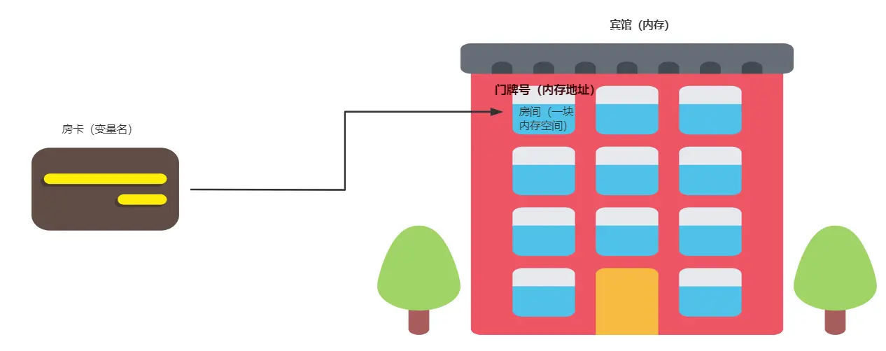 为了便于理解,我们可以把内存理解为宾馆,把内存中的一块空间理解为一个房间,把房间里的物品理解为数据,把房间的门牌号理解为内存地址,把房卡理解为变量名。