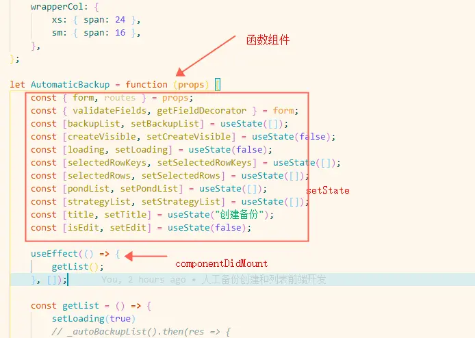 在这里,发现用的是函数组件,useState来定义state,useEffect来初始获取接口数据,比如查询列表等等。使用hooks的目的是让函数组件具备class组件的能力。