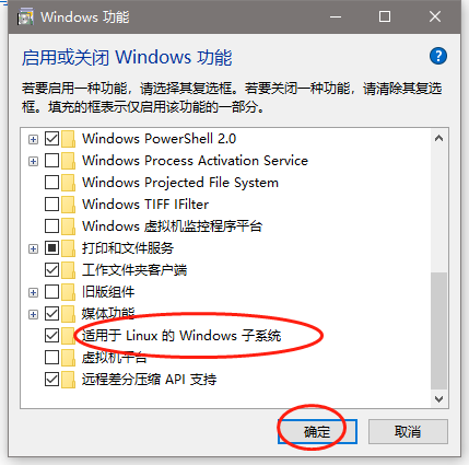 2.打开子系统(控制面板->程序->启动或关闭windos功能)