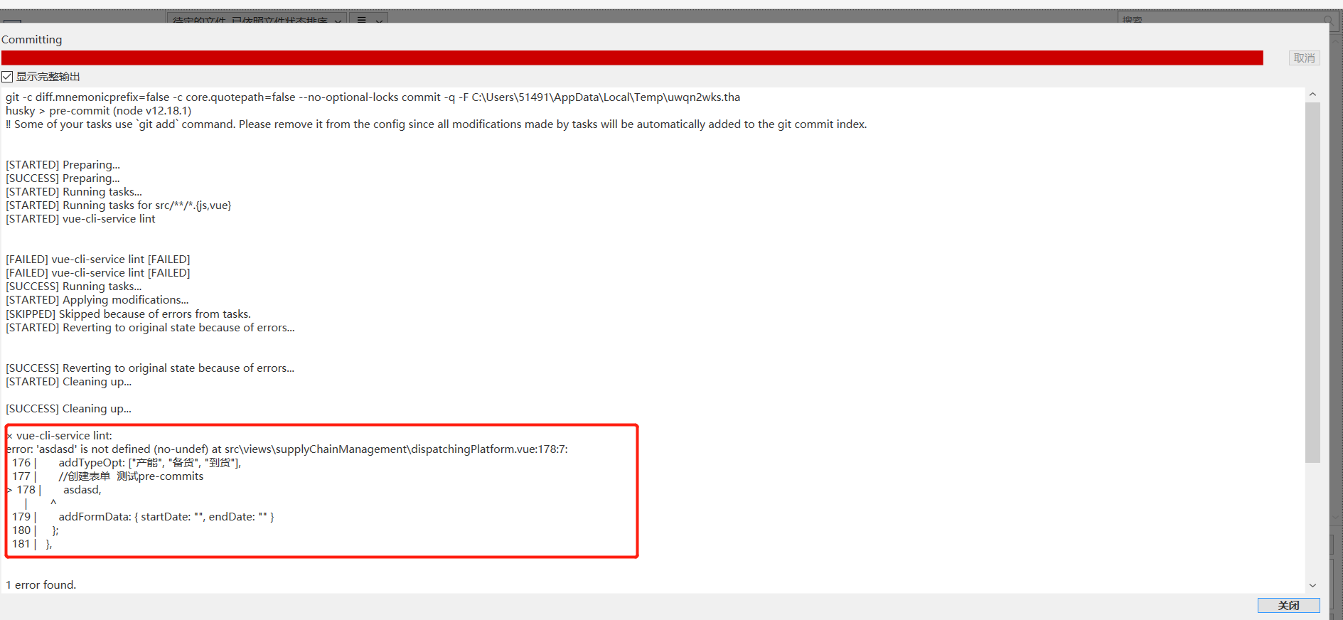 第四步 测试能够验证,但不能自动格式化代码,提交失败的情况