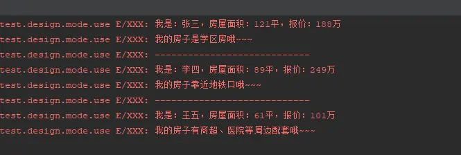 最后,进行测试。首先创建了具体的中介者对象,以及3个卖家对象,并把卖家对象设置到中介。打印输出如下图所示。