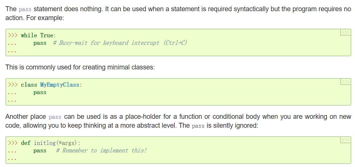 简单而言,pass 是一种空操作(null operation),解释器执行到它的时候,除了检查语法是否合法,什么也不做就直接跳过。