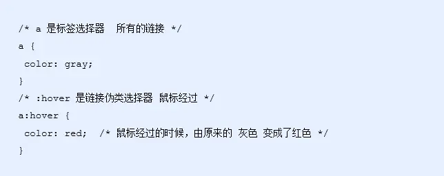 - 伪类选择器书写最大的特点是用冒号(:)表示,比如