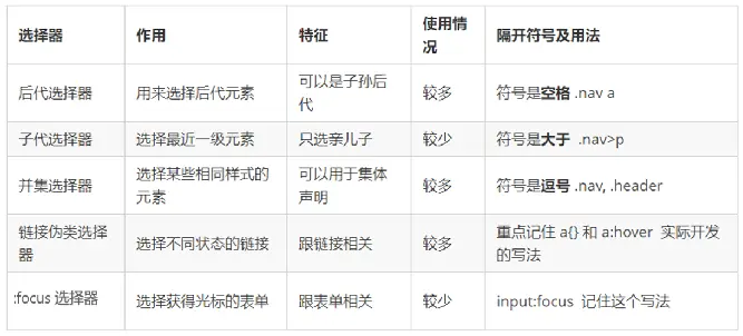 - 常用的复合选择器包括:后代选择器、子选择器、并集选择器、伪类选择器等等