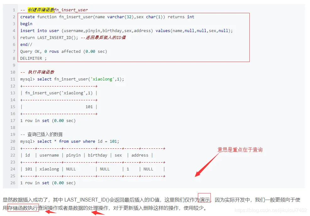这里命名存储函数时使用了【fn_】作为开头,这样可以更容易区分与【sp_】开头的存储过程,从上述语句可以看出前面在存储过程分析的流程语句也是可以用于存储函数的,同样的,DECLARE声明变量和SET设置变量也可用于存储函数,当然包括定义异常处理语句也是适应的,请注意执行存储函数使用的是select关键字,可同时执行多个存储函数,嗯,存储函数就这样定义,是不是跟存储过程很相似呢?但还是有区别的,这点留到后面分析。ok~,为了进一步熟悉存储函数,下面编写一个用于向user插入用户的存储函数: