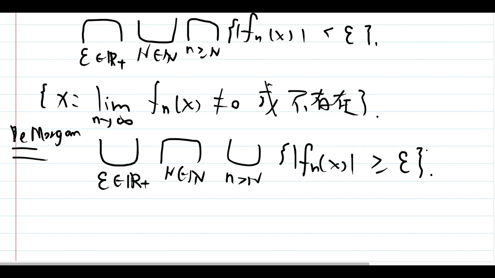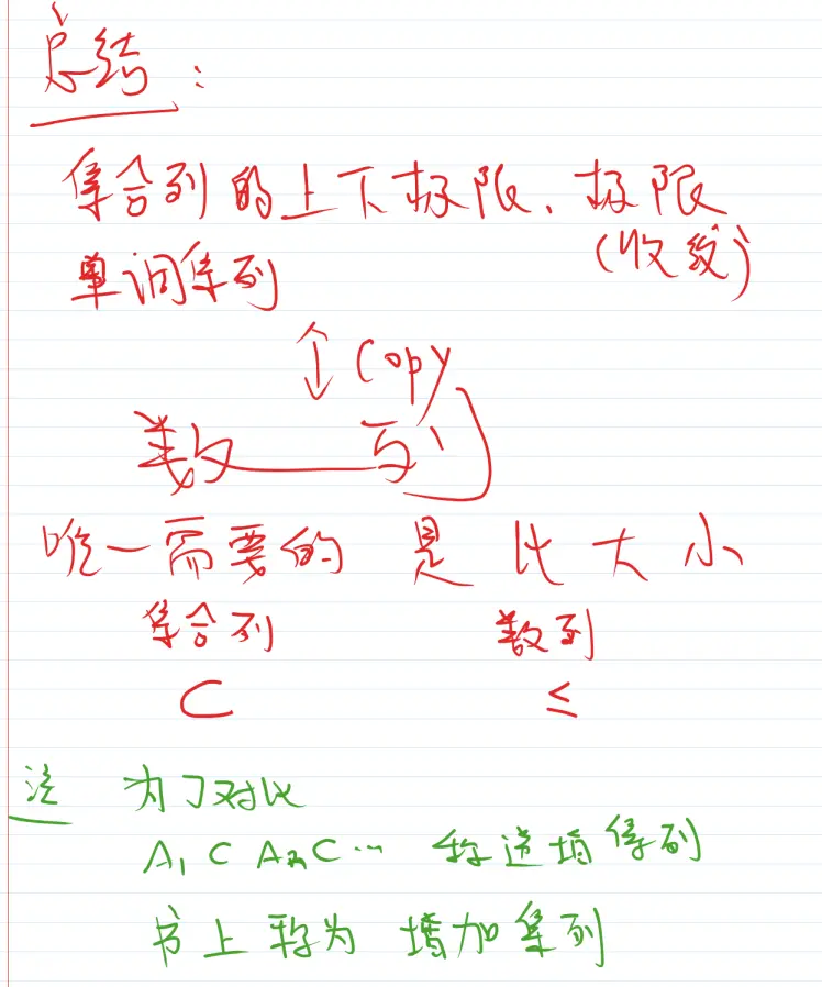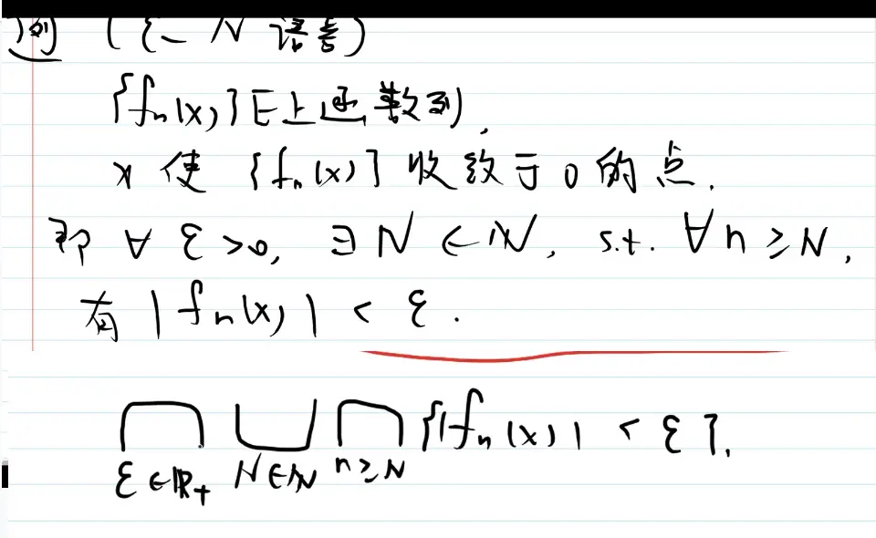 实变函数基础 赤西沽 2020-07-27 260 阅读1分钟 1集合的表示与运算 ♥集合的交集和并集的内涵 并--存在 交--任意 例子: 如何证明两个集合相等 A包含于B B包含于A 则A=B 总结: 2集合列的上极限和下极限 有限函数:取值为实数的函数 总结: