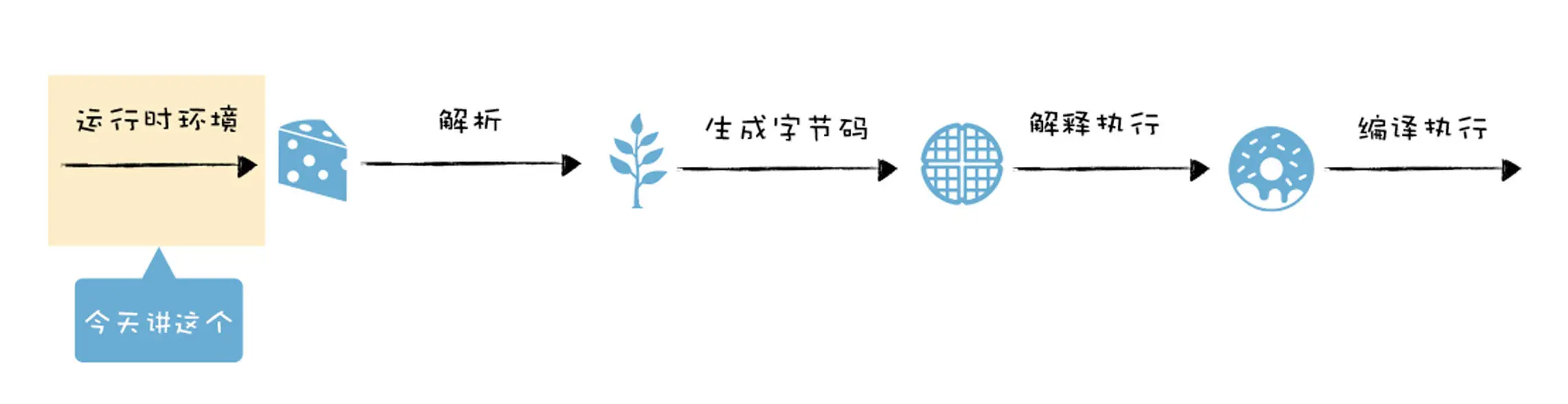 在执行JS之前,V8就准备好了代码的运行时环境,这个环境包括了堆空间和栈空间,全局执行上下文,全局作用域,内置的构建函数,宿主环境提供的扩展函数和对象,消息循环系统等。准备好运行时环境后,V8才开始执行JS代码:解析源码,生成字节码,解释执行和编译执行等操作。