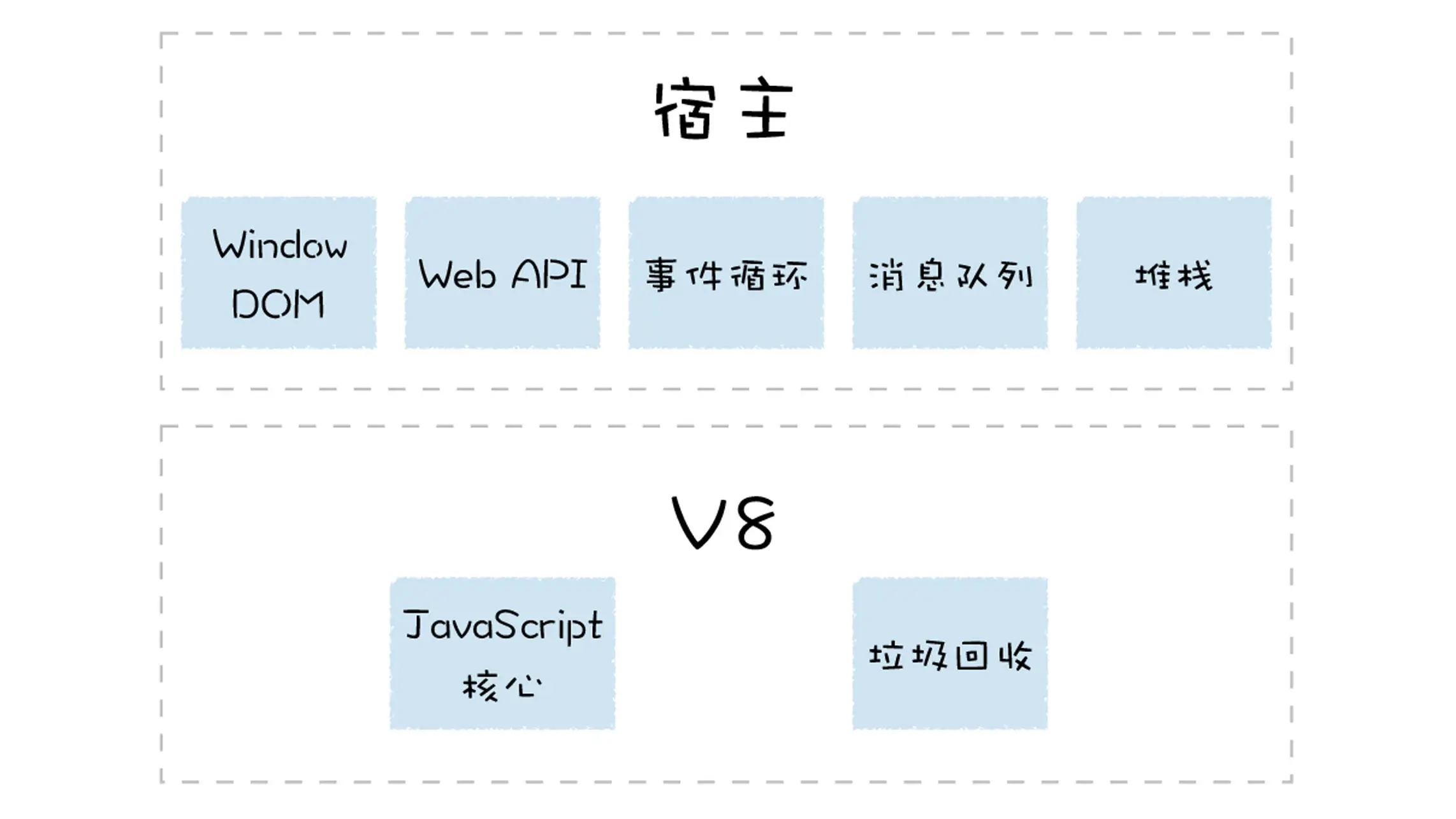 浏览器和Node.js都是V8的宿主环境,浏览器为V8提供基础的消息循环系统,全局变量,Web API。V8的核心是实现ECMAScript标准,提供ECMAScript定义的对象和核心函数,比如Object, function等,V8还提供垃圾回收器,协程等基础内容。V8使用不当会占用主线程资源,导致浏览器卡死。