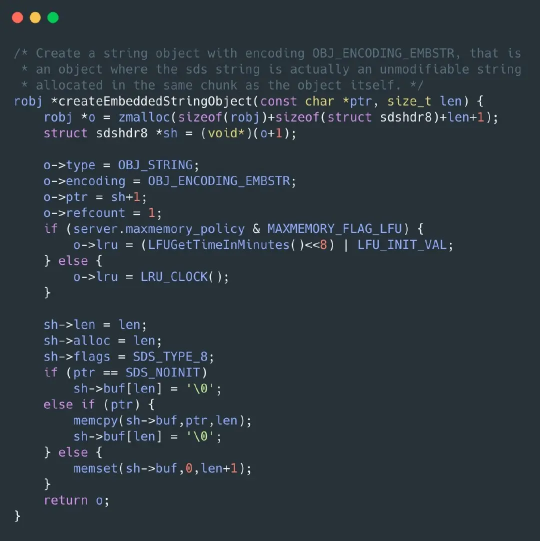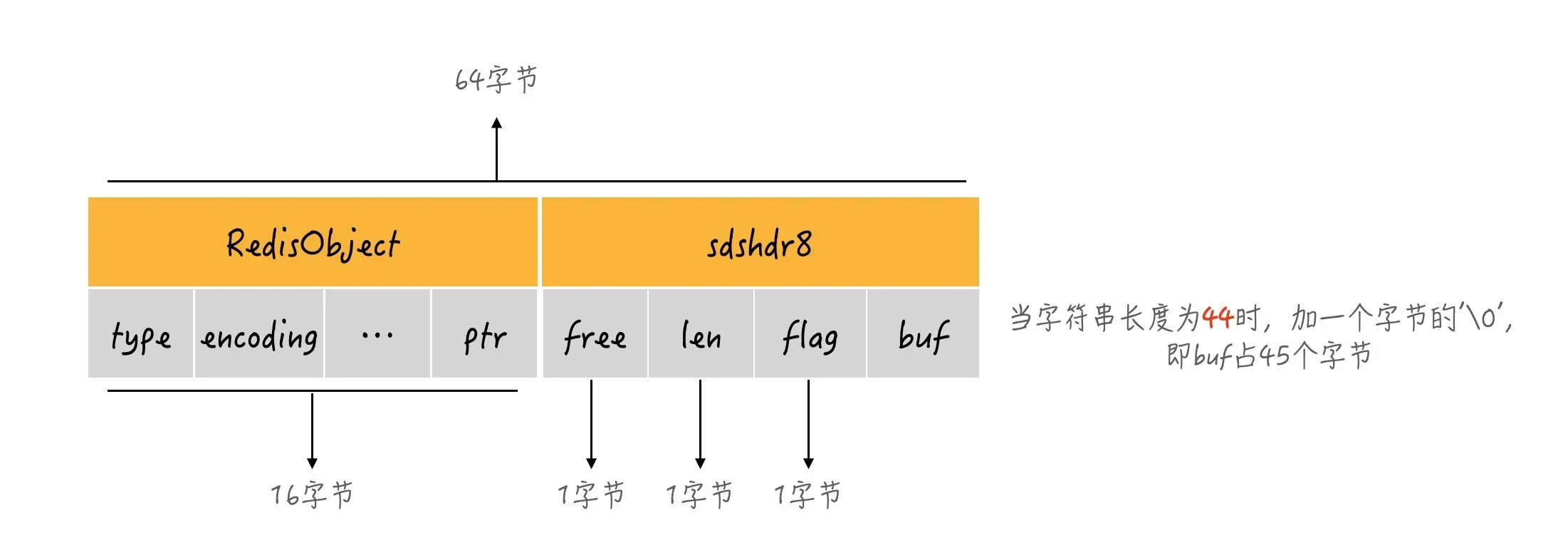redis认为如果超过64字节就是大字符串,所以在RedisObjec+sdshdr8的总长度是64字节的情况下,那么留给buf的长度就只剩下45字节,由于字符串结尾需要一个\0占用一个字节,所以留个字符串的长度就只有44字节了