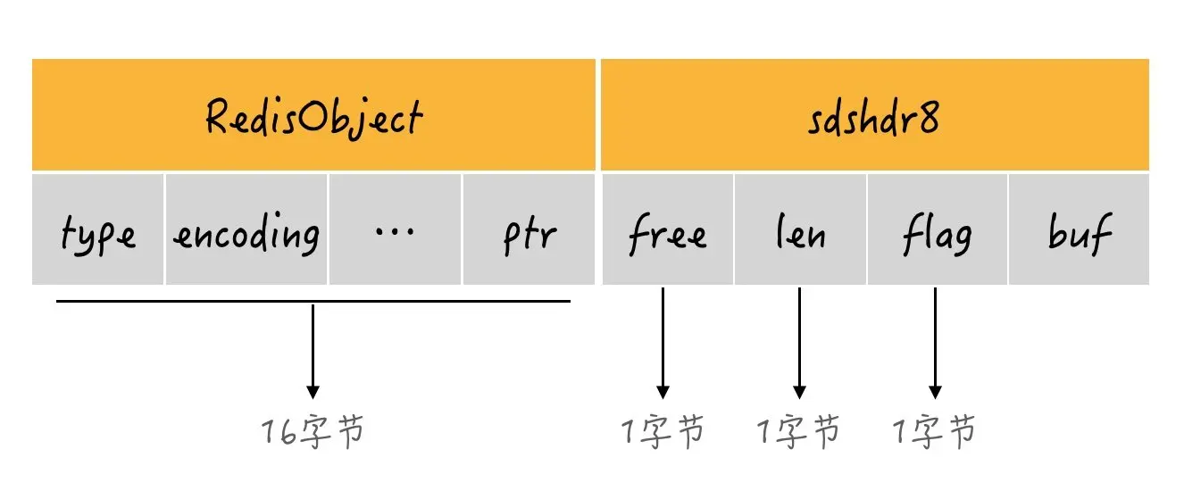 根据redis创建embstr字符串对象的逻辑,是使用了sdshdr8创建embstr,那么加上RedisObject就会变成下面这样
