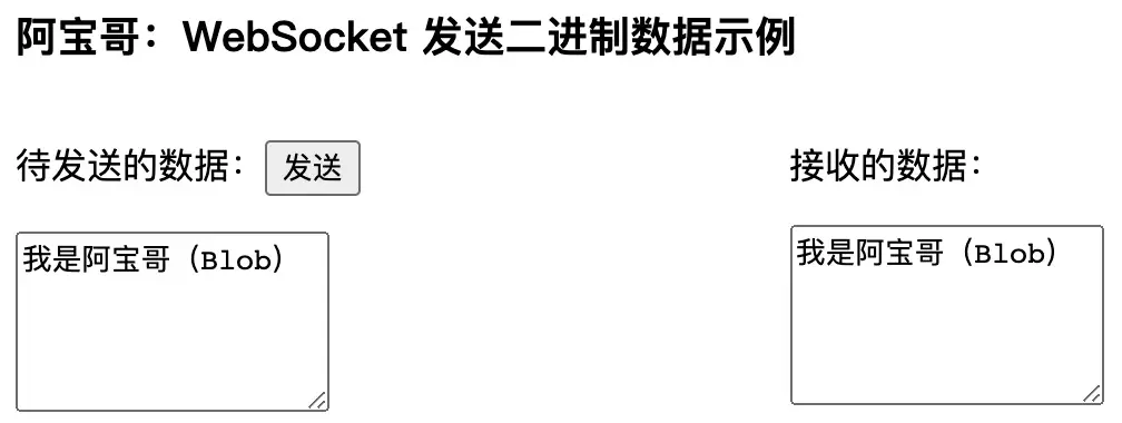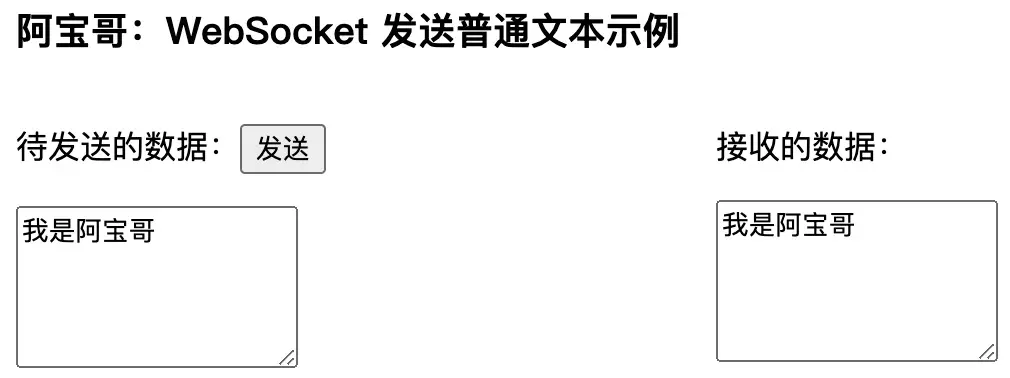 在以上示例中,我们在页面上创建了两个 textarea,分别用于存放 待发送的数据 和 服务器返回的数据。当用户输入完待发送的文本之后,点击 发送 按钮时会把输入的文本发送到服务端,而服务端成功接收到消息之后,会把收到的消息原封不动地回传到客户端。