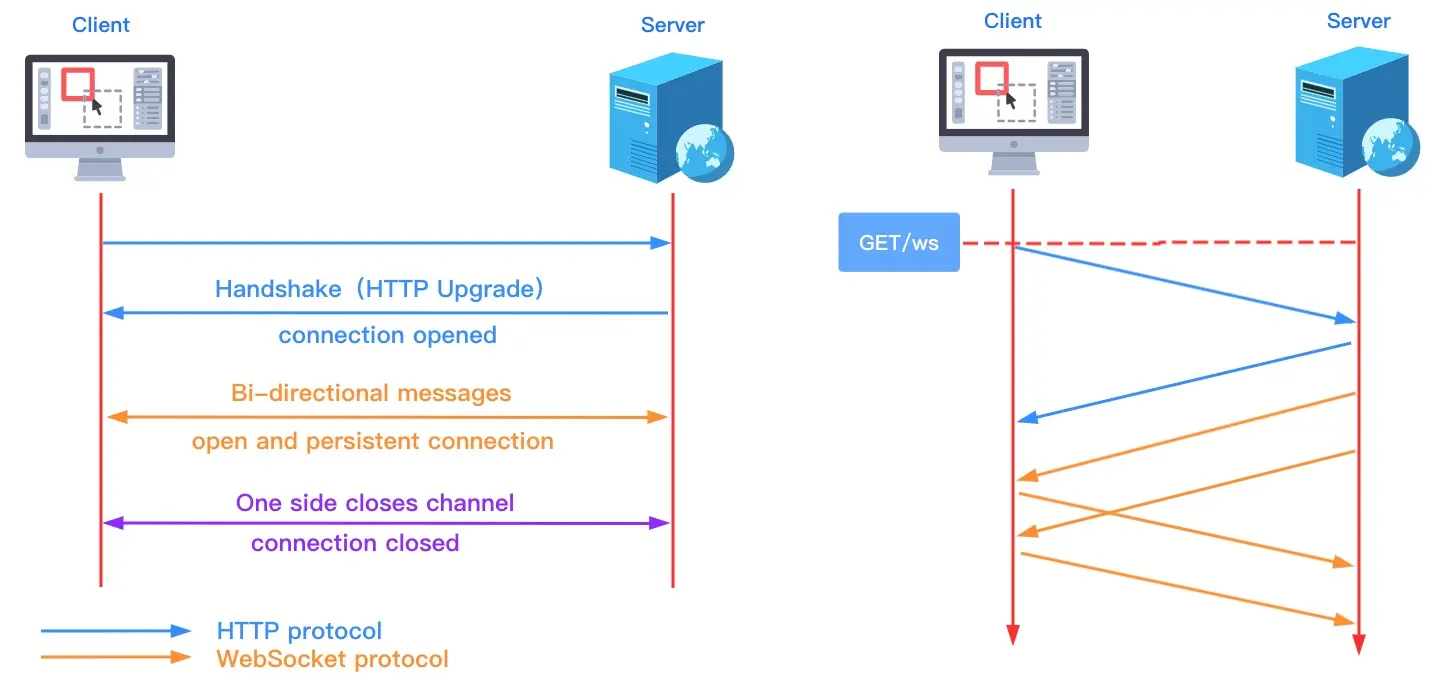 WebSocket 是一种与 HTTP 不同的协议。两者都位于 OSI 模型的应用层,并且都依赖于传输层的 TCP 协议。 虽然它们不同,但是 RFC 6455 中规定:WebSocket 被设计为在 HTTP 80 和 443 端口上工作,并支持 HTTP 代理和中介,从而使其与 HTTP 协议兼容。 为了实现兼容性,WebSocket 握手使用 HTTP Upgrade 头,从 HTTP 协议更改为 WebSocket 协议。