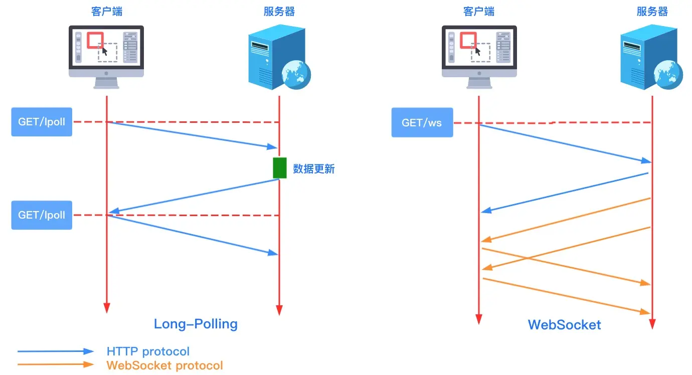早期,很多网站为了实现推送技术,所用的技术都是轮询。轮询是指由浏览器每隔一段时间向服务器发出 HTTP 请求,然后服务器返回最新的数据给客户端。常见的轮询方式分为轮询与长轮询,它们的区别如下图所示: