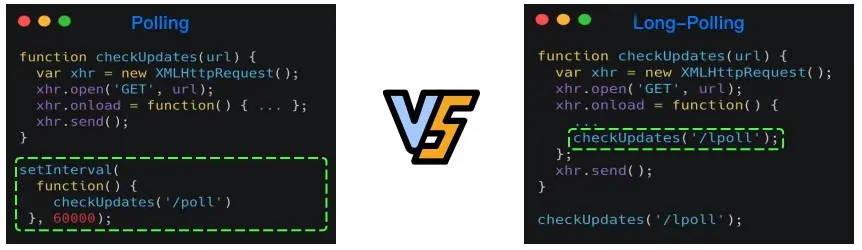 介绍完轮询和 WebSocket 的相关内容之后,接下来我们来看一下 XHR Polling 与 WebSocket 之间的区别: