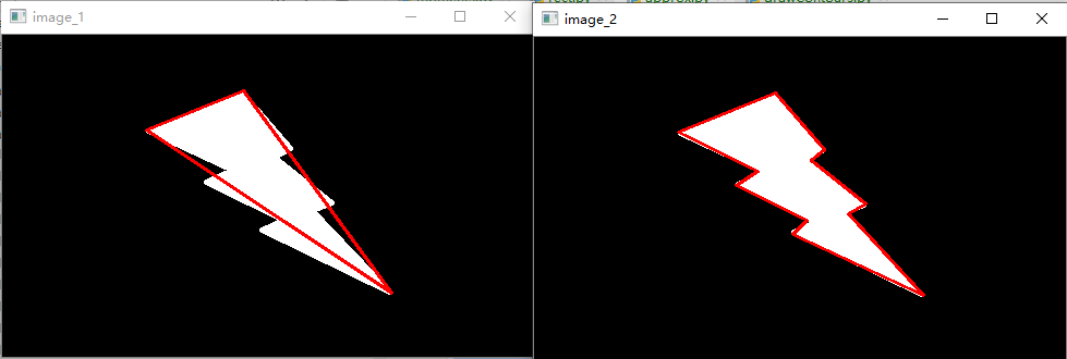 第一张图是 epsilon 为原始轮廓周长的 10% 时的近似轮廓,第二张图中绿线就是 epsilon 为原始轮廓周长的 1% 时的近似轮廓。