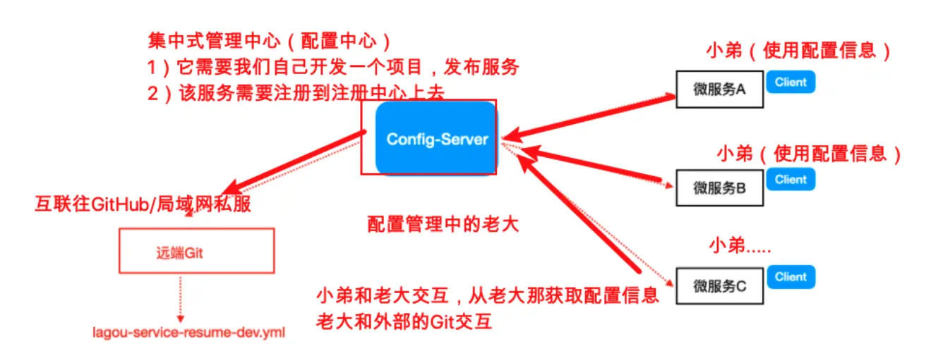Config Server是集中式的配置服务,⽤于集中管理应⽤程序各个环境下的配置。 默认使⽤Git存储配置⽂件内容,也可以SVN。