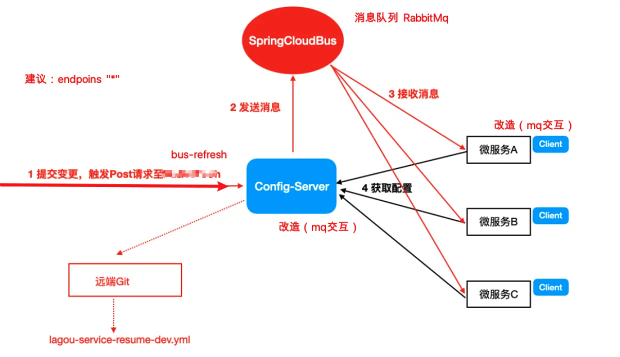- 微服务暴露端⼝ 重启各个服务,更改配置之后,向配置中⼼服务端发送post请求 http://localhost:9003/actuator/bus-refresh, 各个客户端配置即可⾃动刷新, 在⼴播模式下实现了⼀次请求,处处更新,如果我只想定向更新呢? 在发起刷新请求的时候http://localhost:9006/actuator/bus-refresh/lagou-service-resume:8081 即为最后⾯跟上要定向刷新的实例的 服务名:端⼝号即可