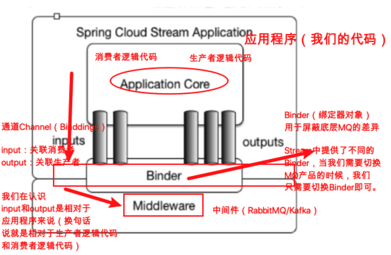 Binder绑定器是Spring Cloud Stream 中⾮常核⼼的概念,就是通过它来屏蔽底层不同MQ消息中间件 的细节差异,当需要更换为其他消息中间件时,我们需要做的就是更换对应的Binder绑定器⽽不需要修改任何应⽤逻辑(Binder绑定器的实现是框架内置的,Spring Cloud Stream⽬前⽀持Rabbit、Kafka两种消息队列)