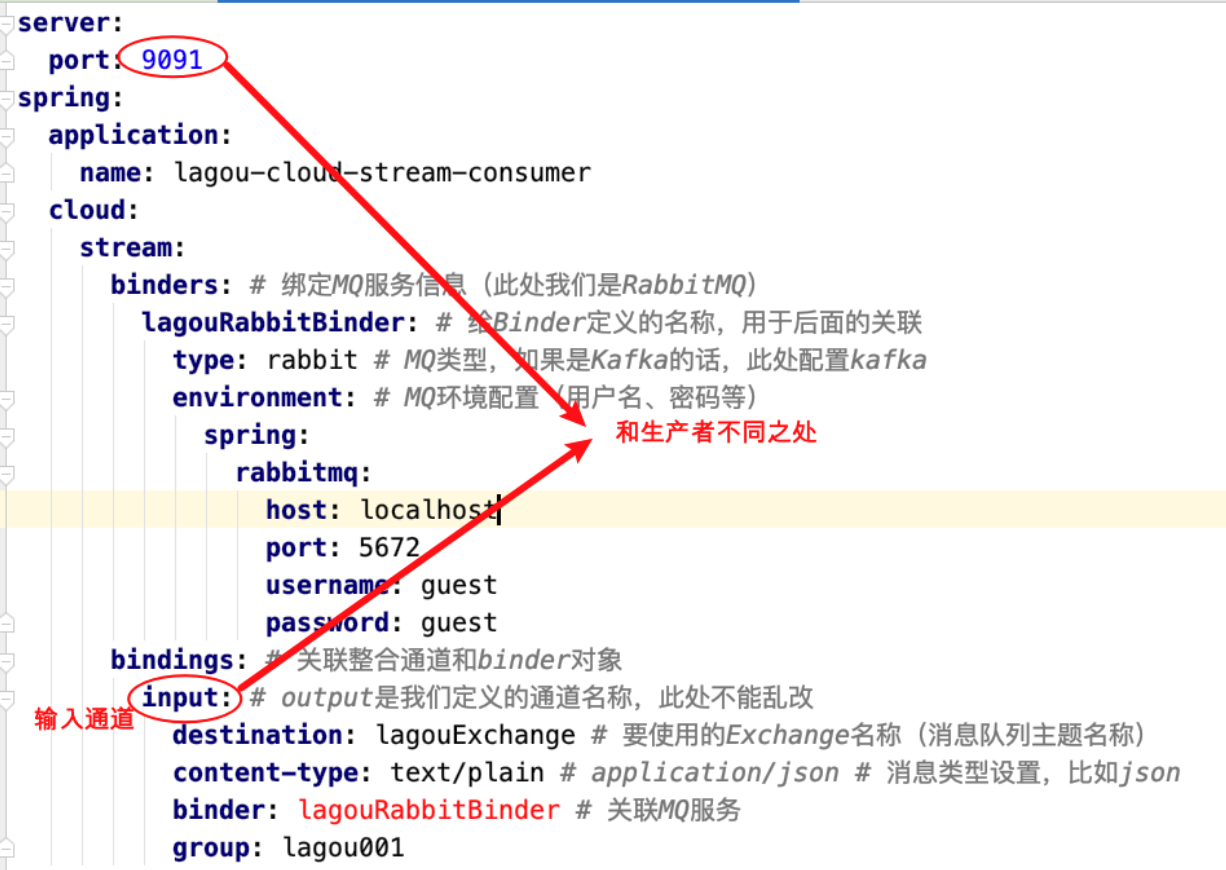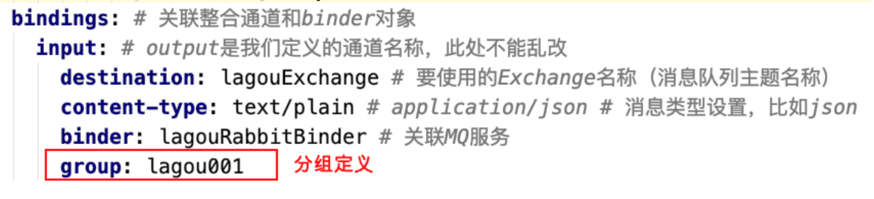 我们仅仅需要在服务消费者端设置 spring.cloud.stream.bindings.input.group 属性,多个消费者实例 配置为同⼀个group名称(在同⼀个group中的多个消费者只有⼀个可以获取到消息并消费)。