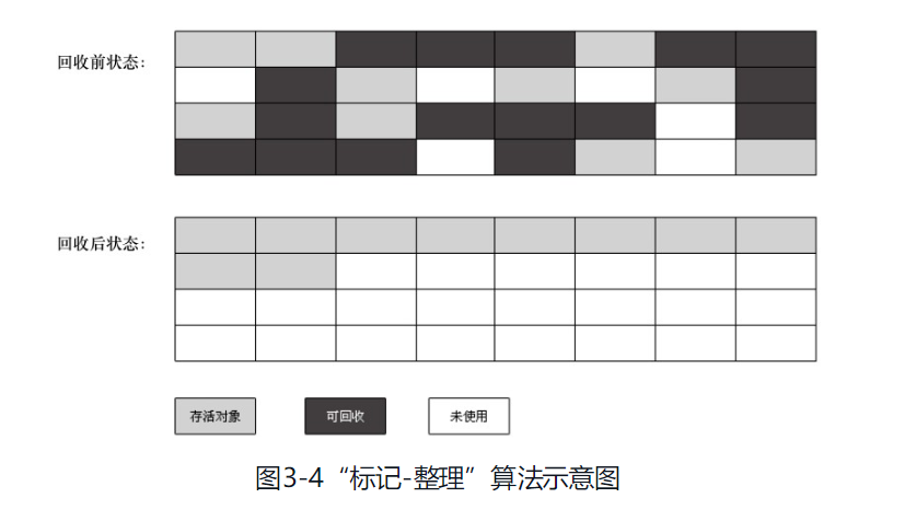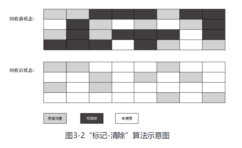 - 空间问题,标记清除之后会产生大量不连续的内存碎片,空间碎片太多可能会导致以后在程序运行过程中需要分配较大对象时,无法找到足够的连续内存而不得不提前触发另一次垃圾收集动作。